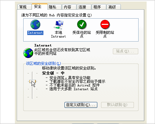 2、在“安全”标签页的下部将安全级别调节至 “安全级 - 中” 一栏: